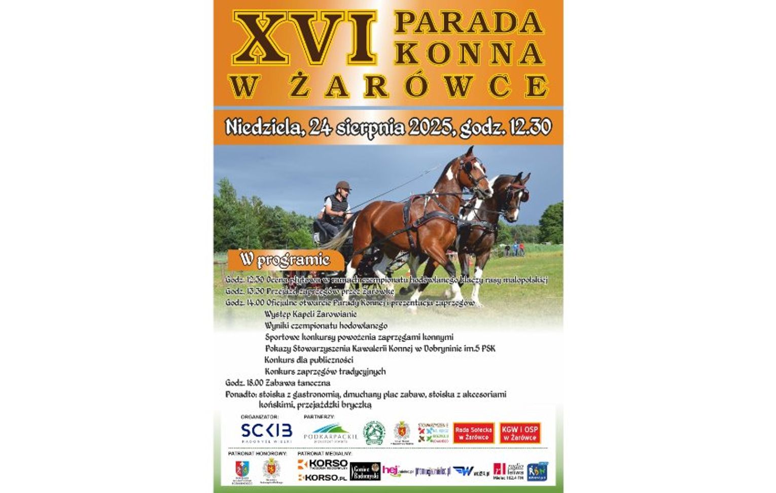 W najbliższą niedzielę, 24 sierpnia organizatorzy zapraszają do Żarówki na 16. Paradę Konną. Partnerem wydarzenia jest Województwo Podkarpackie.