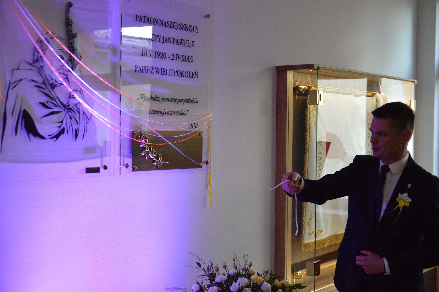 Po nabożeństwie odbyło się poświęcenie sztandaru szkoły oraz uroczyste odsłonięcie pamiątkowej tablicy, a następnie zgromadzeni udali się do hali sportowej, gdzie uczniowie zaprezentowali wzruszający program artystyczny poświęcony swojemu Patronowi.