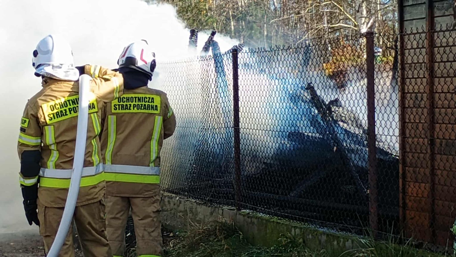 Na miejscu stwierdzono iż pali się drewniana wiata- drewutnia przed domem o wymiarach 10 x4 x3. Na miejscu nie stwierdzono osób poszkodowanych, brak bliskości fotowoltaiki.