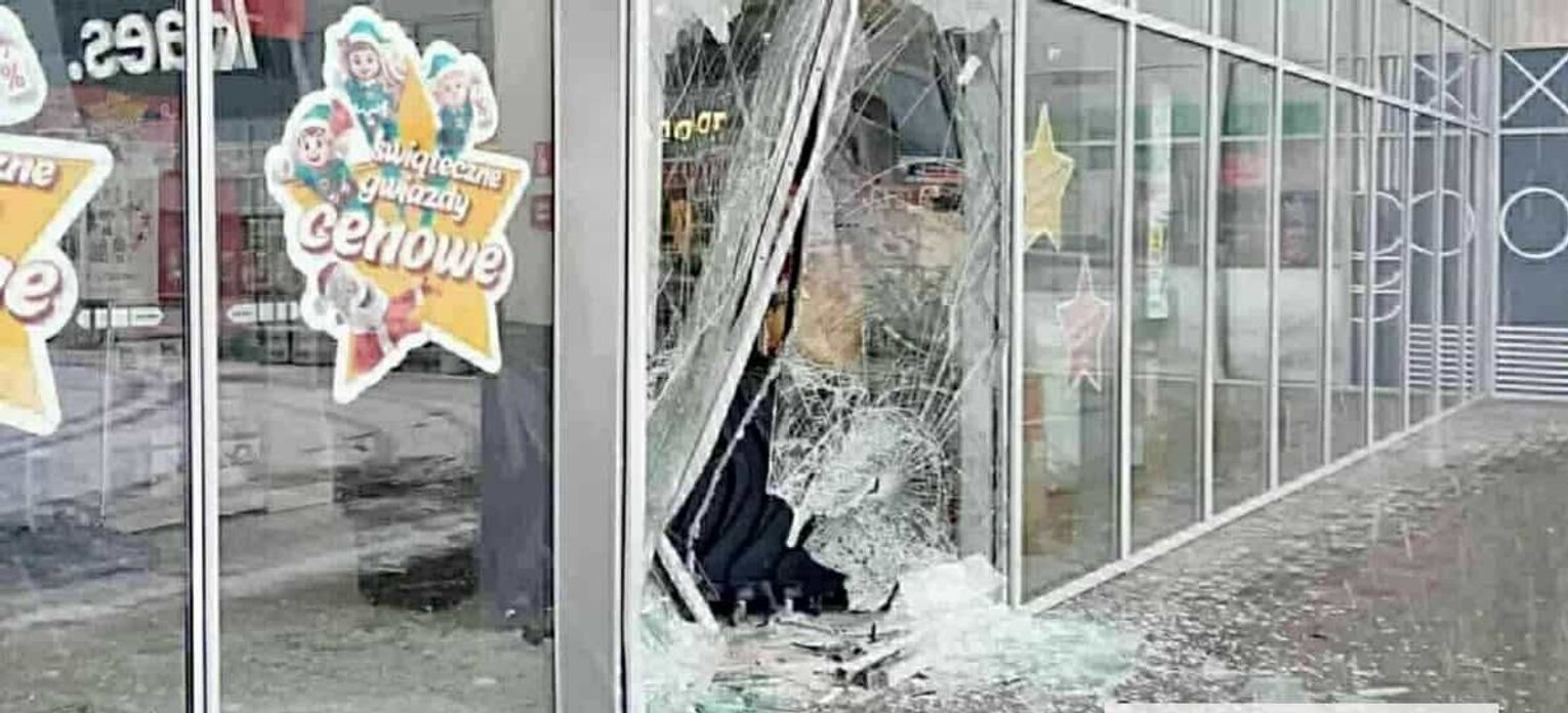stracił panowanie nad pojazdem nie zdziałały hamulce na śliskiej powierzchni i wjechał do jednego ze sklepów znajdujących się na terenie obiektu.