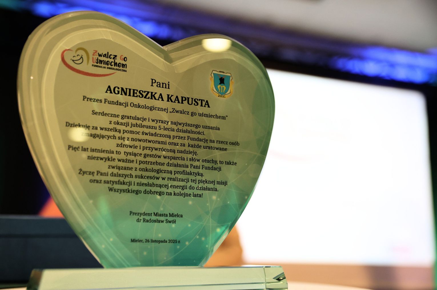 To był wieczór pełen emocji, wzruszeń i wdzięczności. W Samorządowym Centrum Kultury w Mielcu odbyła się uroczysta gala z okazji 5-lecia działalności Fundacja Onkologiczna „Zwalcz go uśmiechem”, na czele której stoi niezastąpiona Prezes, Agnieszka Kapusta. Od pięciu lat z ogromną energią aktywizuje mielczan do dbania o siebie, promuje profilaktykę, zachęca do badań i zaraża pozytywną postawą – zawsze z uśmiechem na twarzy.