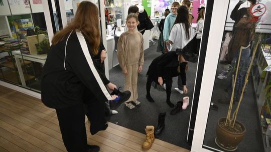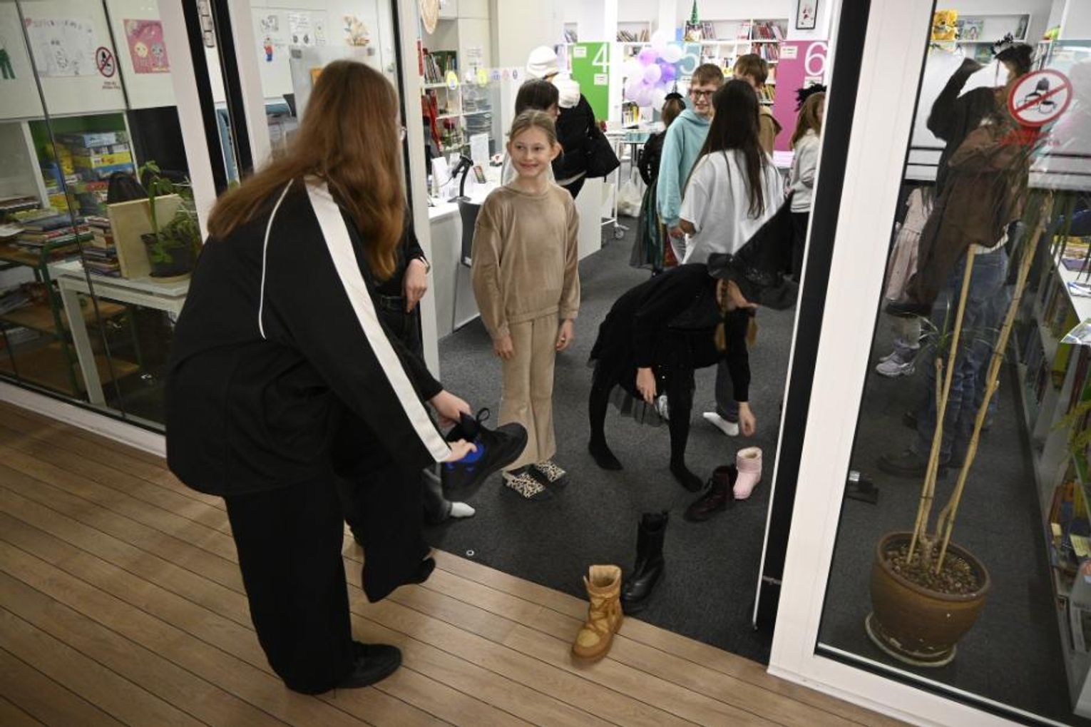 Wędrujące buciki dzielnie maszerowały od regałów aż do drzwi, wywołując salwy śmiechu.