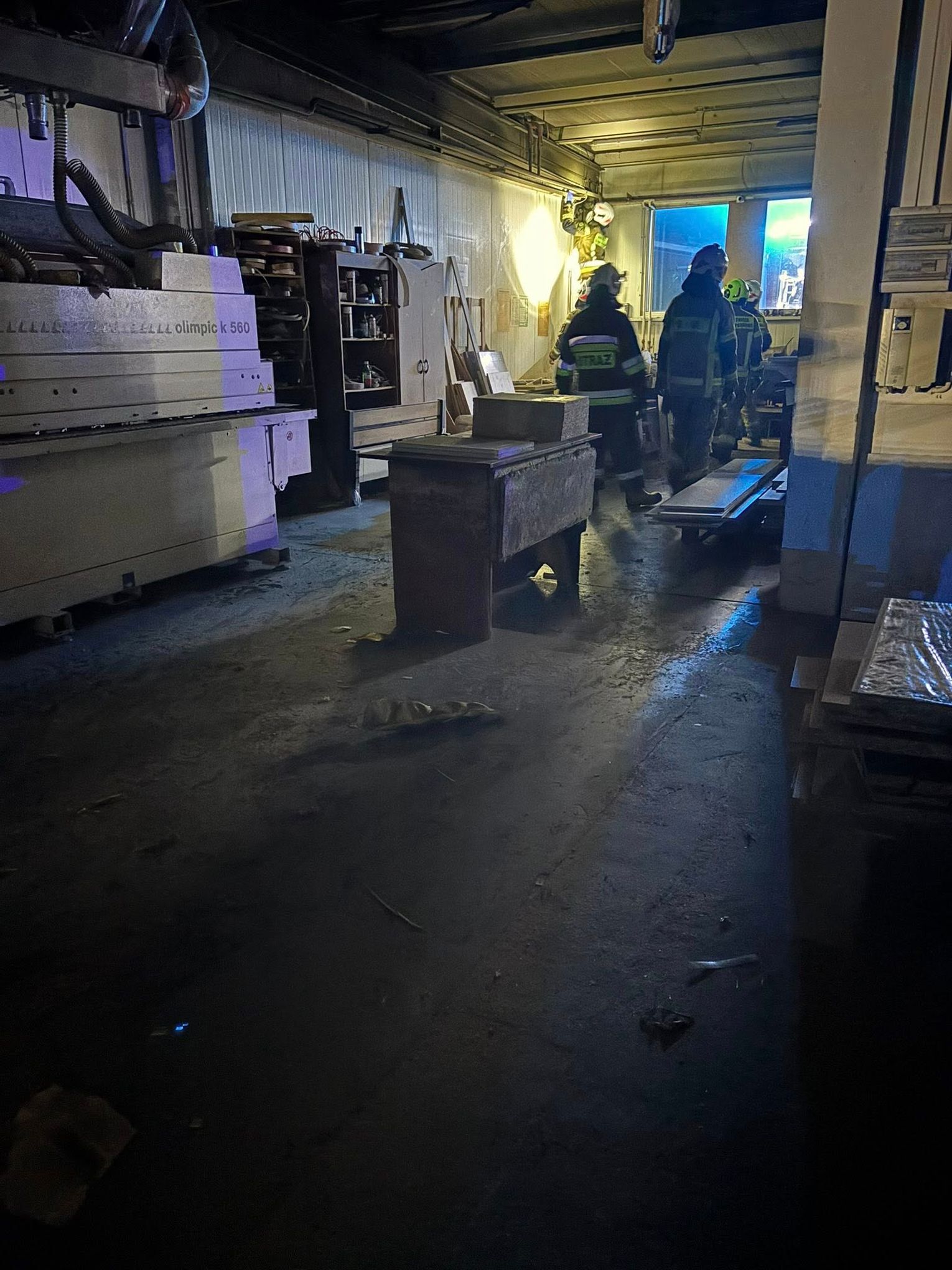 Po przybyciu na miejsce jednostki OSP potwierdziły zdarzenie. Na hali w firmie produkującej płyty wiórowe doszło do pożaru. Powodem było zapalenie się odpadów/ ścinki po obróbce płyt/ wewnątrz hali.