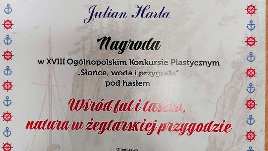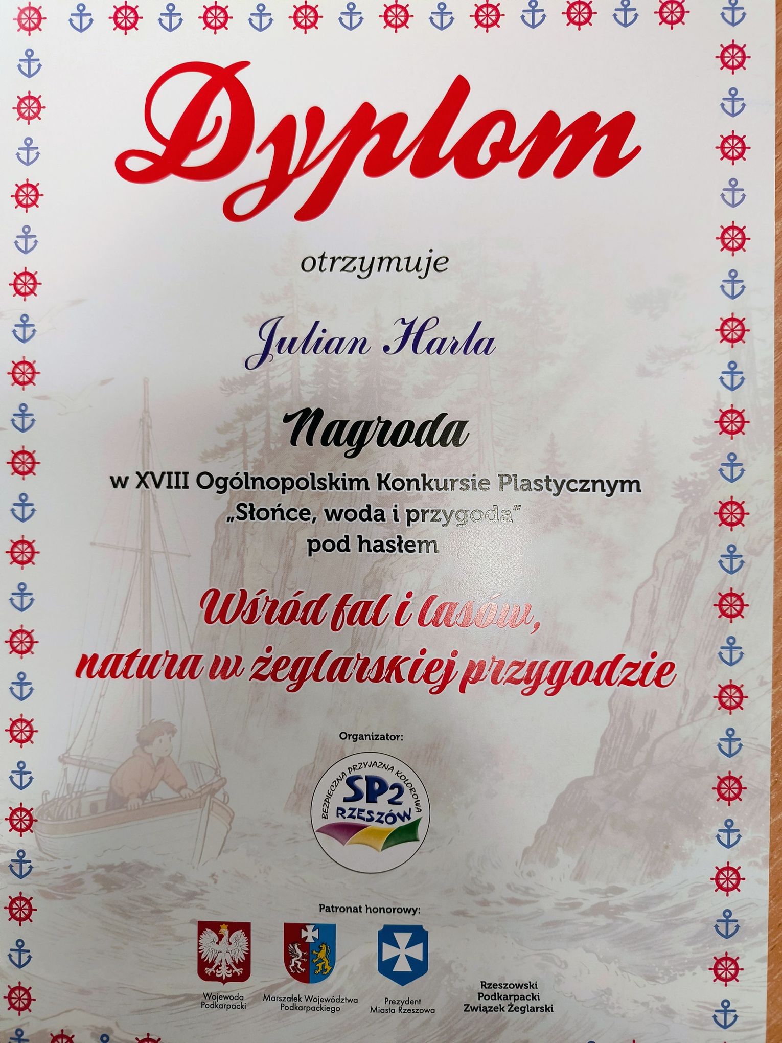 W tegorocznej edycji XVIII Ogólnopolskiego Konkursu Plastycznego „SŁOŃCE, WODA I PRZYGODA" pod hasłem: „Wśród fal i lasów, natura w żeglarskiej przygodzie", organizowanego przez Szkołę Podstawową nr 2 w Rzeszowie, praca 6-letniego Juliana Harli zdobyła jedną z pięciu nagród, przyznanych dzieciom w kategorii: przedszkola.