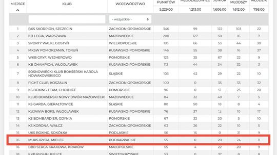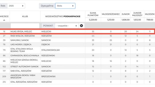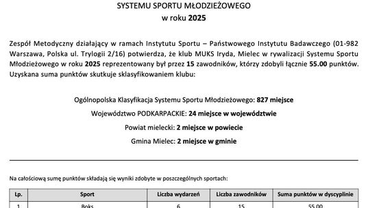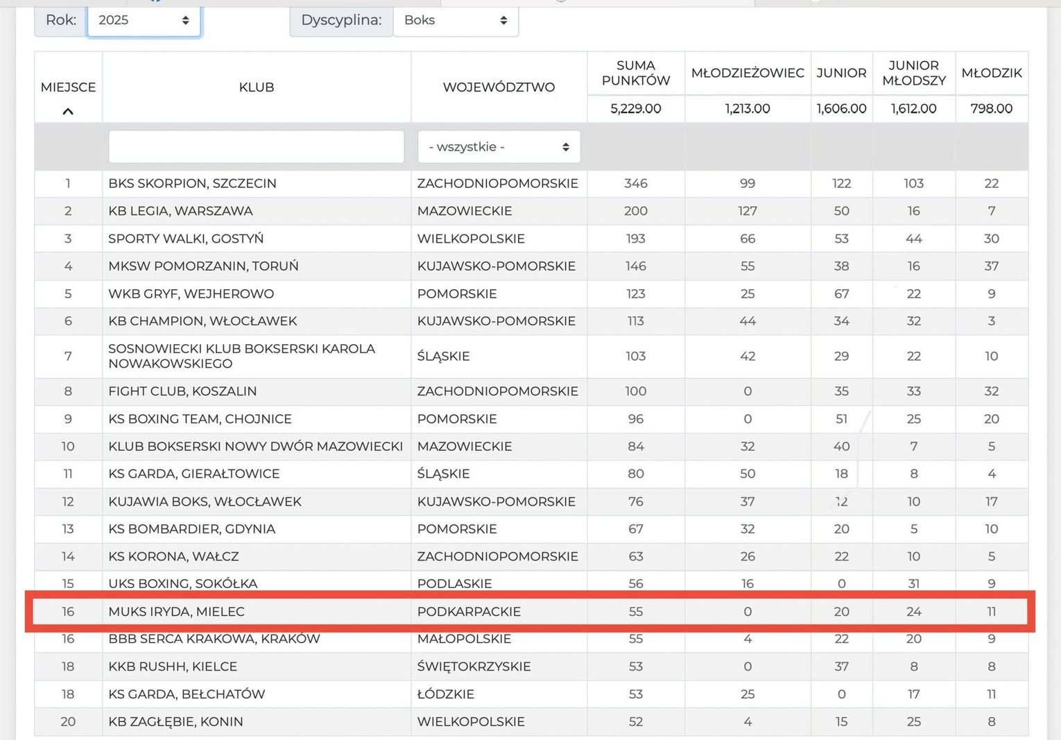 Rok 2025 dla IRYDY był to rok pełen wyzwań, ale przede wszystkim spektakularnych sukcesów. Mielecki Klub Bokserski Iryda podsumował rok 2025, ogłaszając wyniki rankingu Systemu Sportu Młodzieżowego Ministerstwa Sportu i Turystyki. Mielczanie zajęli wysokie 16. miejsce w kraju na ponad 300 klubów bokserskich, po raz szósty z rzędu broniąc tytułu Drużynowego Mistrza Podkarpacia.