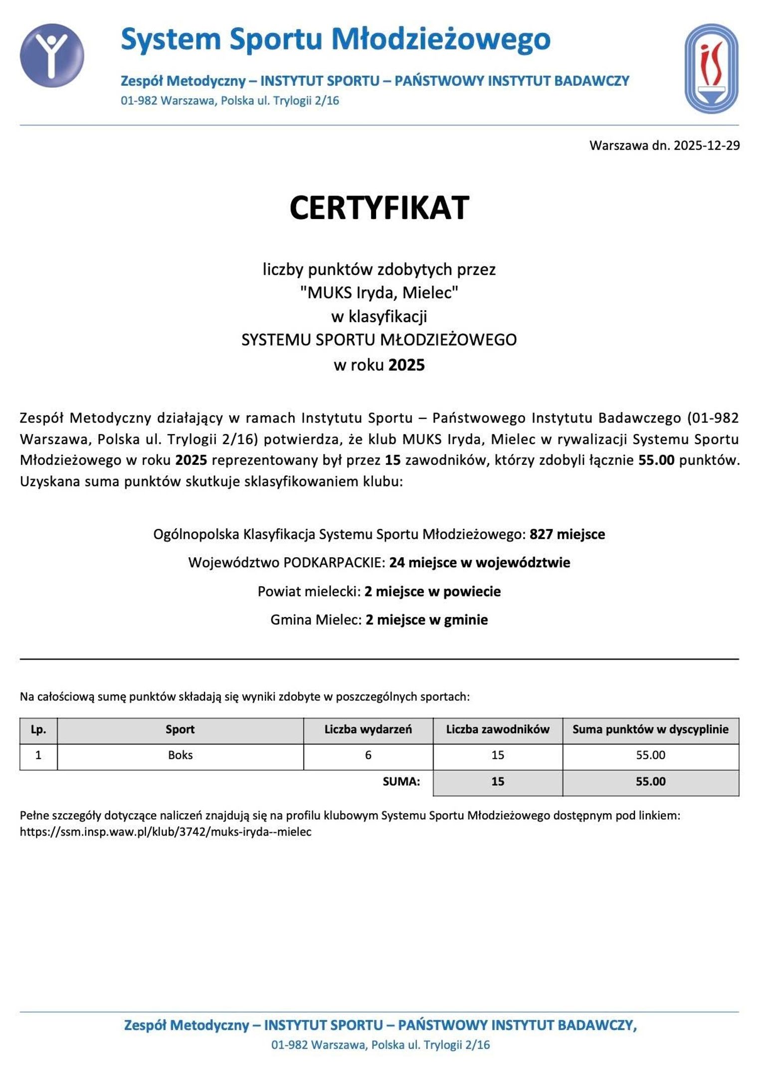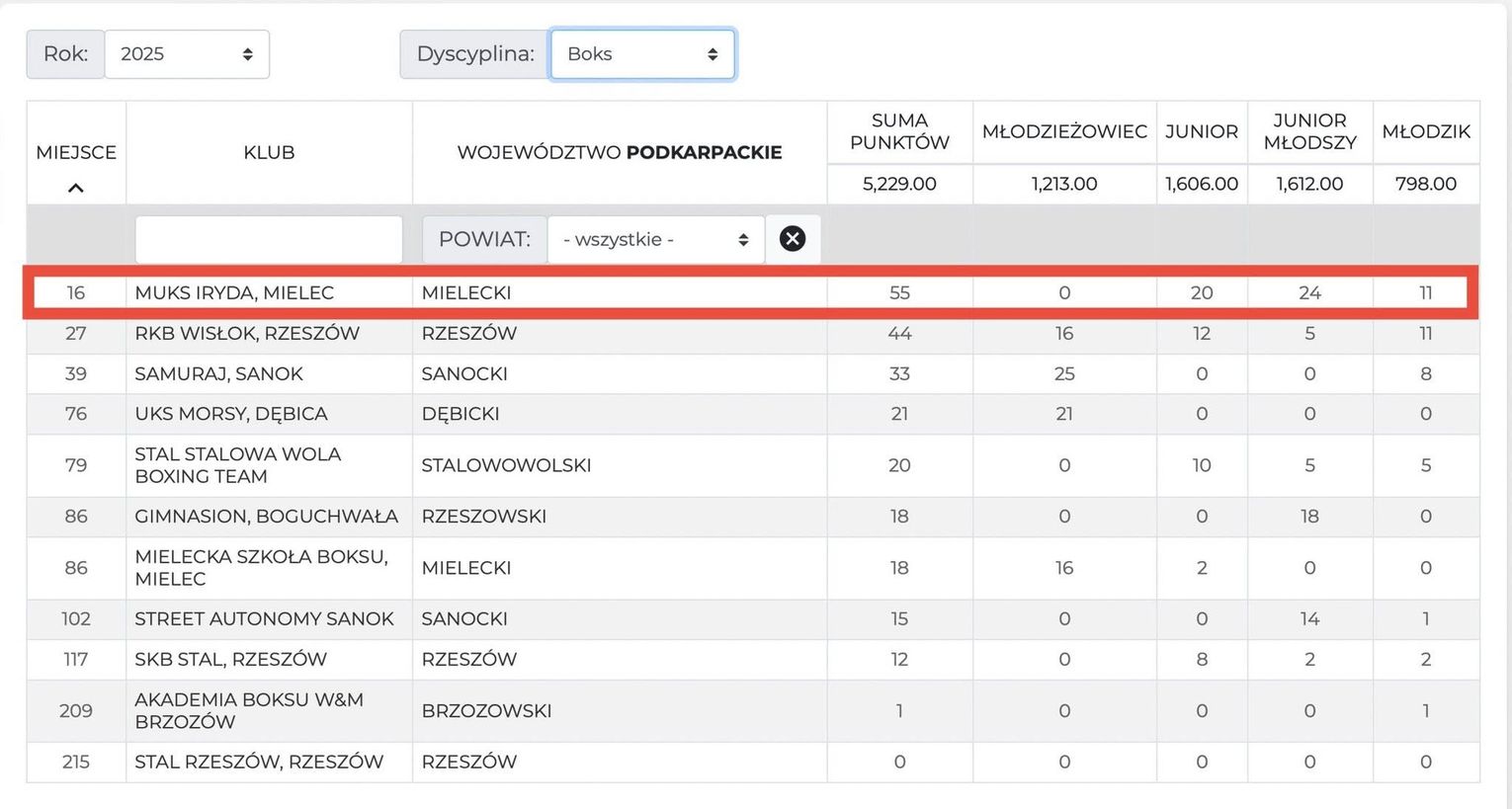 Wynik ten oznacza, że Iryda jest oficjalnie najlepszym klubem bokserskim w Mielcu oraz w całym województwie podkarpackim. Co więcej, w rankingu obejmującym wszystkie dyscypliny sportowe, bokserzy Irydy zajęli 2. miejsce w Powiecie Mieleckim, ustępując jedynie lekkoatletom LKS Stal Mielec. Warto podkreślić, że przez kilka sezonów bokserzy Irydy trenowali na ich obiektach, a wsparcie oraz życzliwość okazana przez LKS Stal Mielec miały istotny wpływ na rozwój klubu, przyczyniając się do obecnych sukcesów sportowych. Iryda Mielec z pełnym uznaniem i wdzięcznością pamięta o tej pomocy. Dodatkowo klub uplasował się na bardzo wysokim 24. miejscu wśród wszystkich klubów sportowych, bez podziału na dyscypliny, na Podkarpaciu