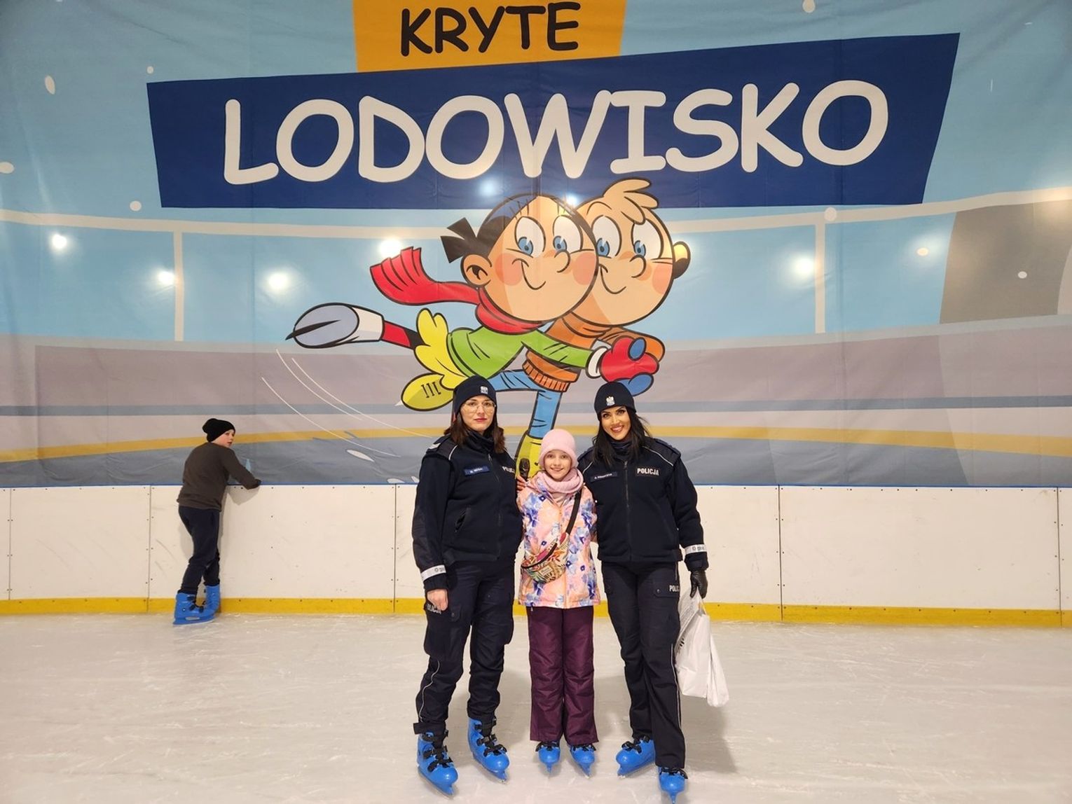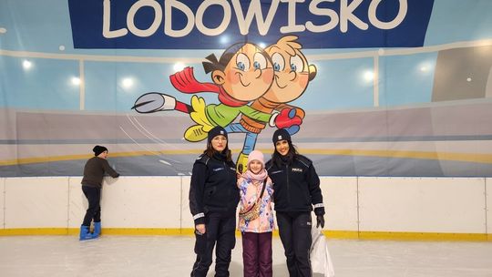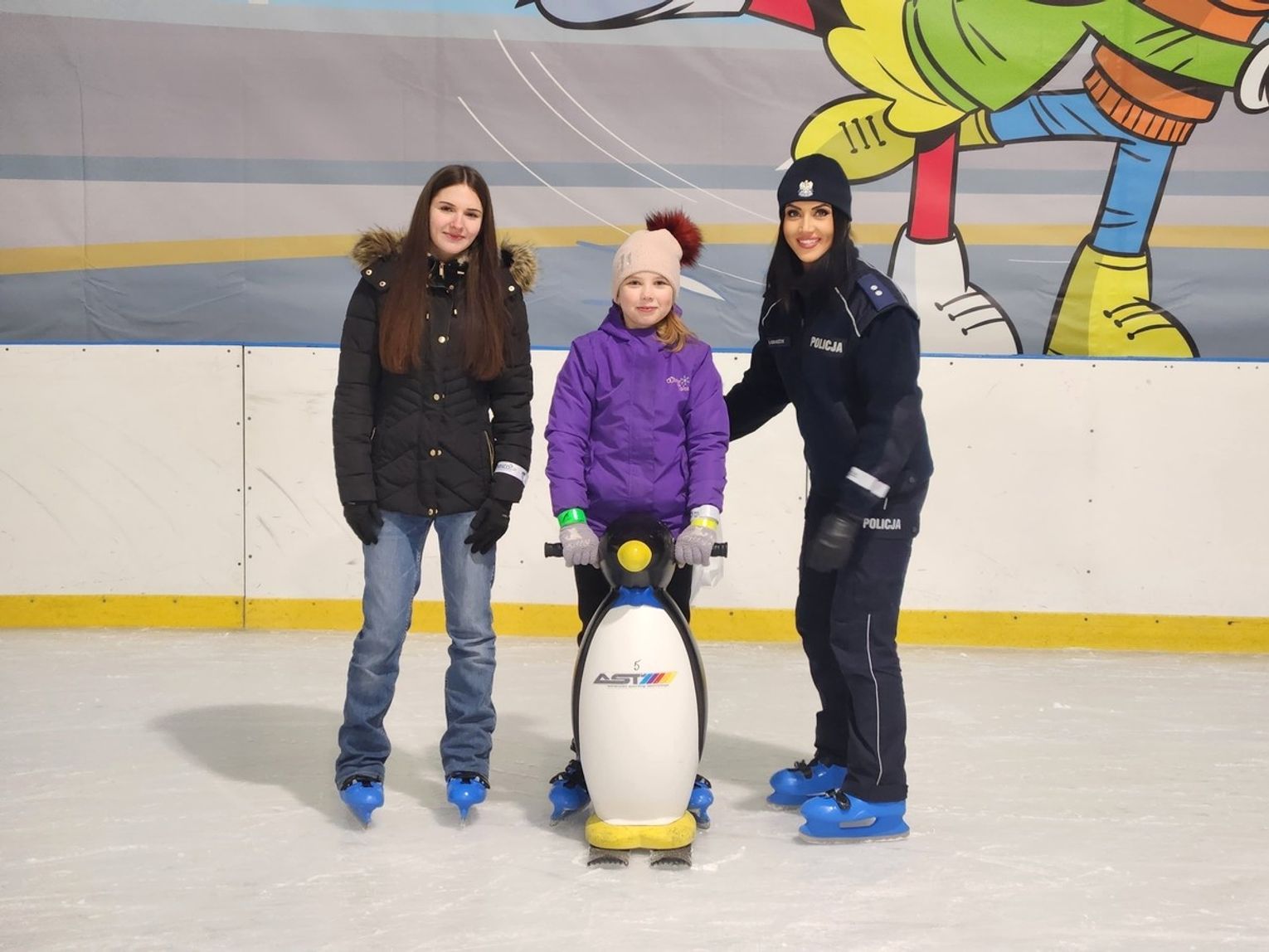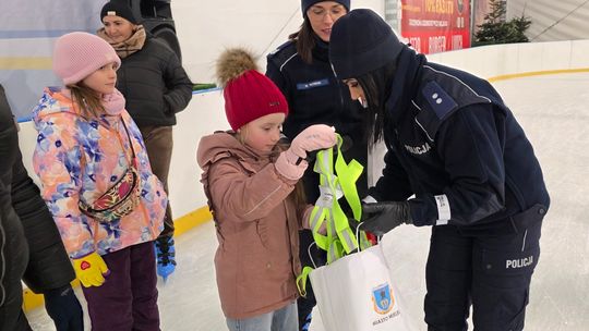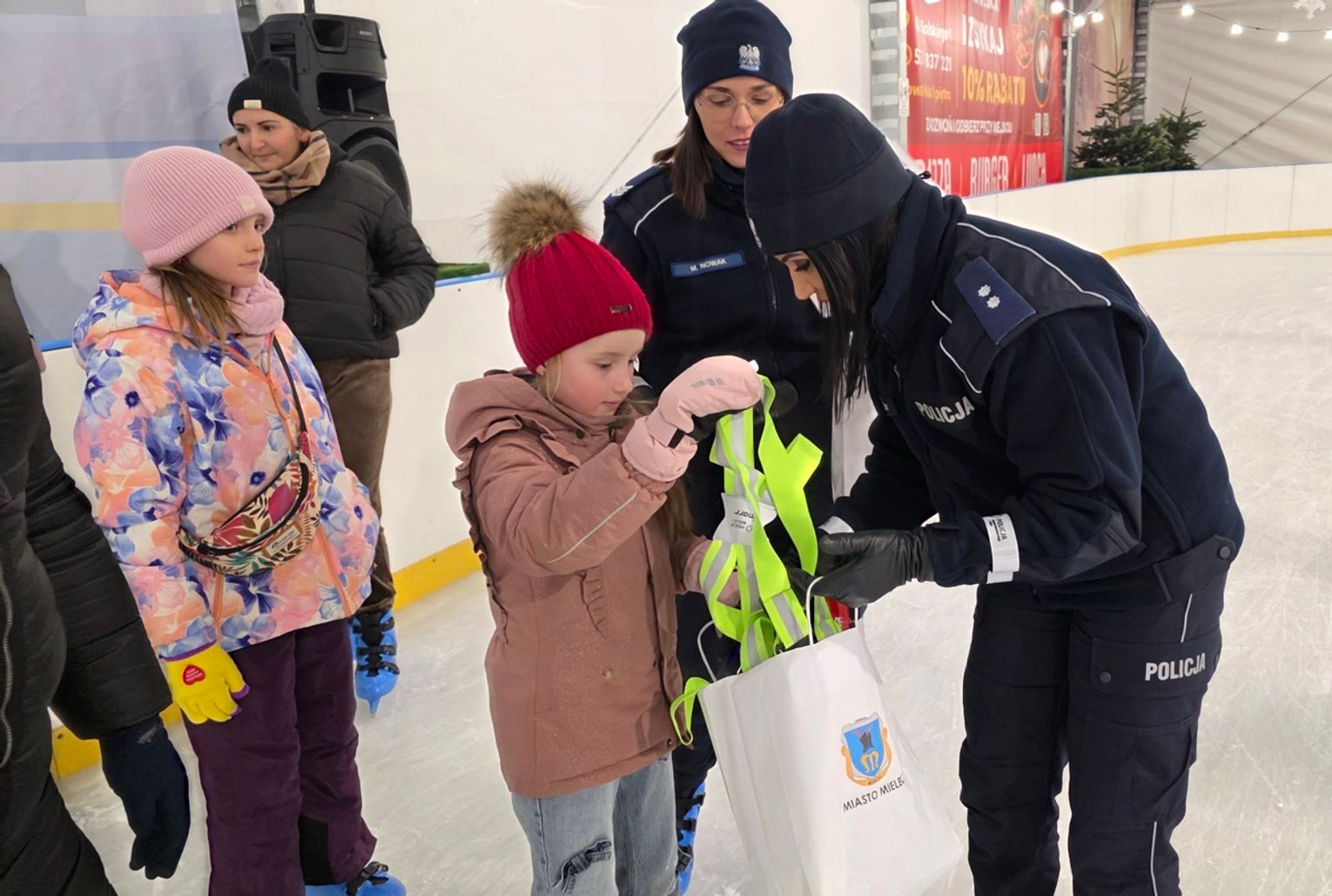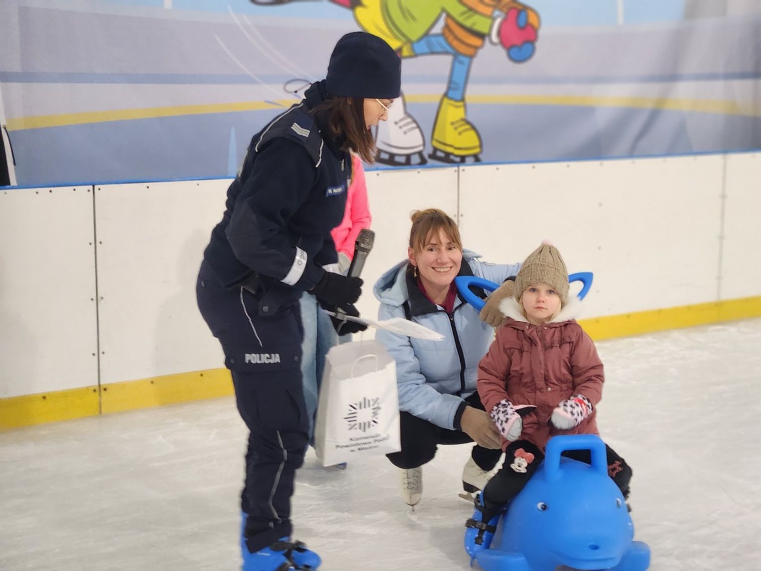 𝐅𝐮𝐧𝐤𝐜𝐣𝐨𝐧𝐚𝐫𝐢𝐮𝐬𝐳𝐤𝐢 𝐊𝐨𝐦𝐞𝐧𝐝𝐲 𝐏𝐨𝐰𝐢𝐚𝐭𝐨𝐰𝐞𝐣 𝐏𝐨𝐥𝐢𝐜𝐣𝐢 𝐰 𝐌𝐢𝐞𝐥𝐜𝐮 𝐩𝐨𝐝𝐤𝐨𝐦. 𝐁𝐞𝐫𝐧𝐚𝐝𝐞𝐭𝐭𝐚 𝐊𝐫𝐚𝐰𝐜𝐳𝐲𝐤 𝐢 𝐬𝐢𝐞𝐫𝐳̇. 𝐬𝐳𝐭. 𝐌𝐚𝐫𝐭𝐚 𝐍𝐨𝐰𝐚𝐤 spotkały się z osobami korzystającymi z lodowiska, przypominając o zasadach bezpiecznej jazdy na łyżwach.