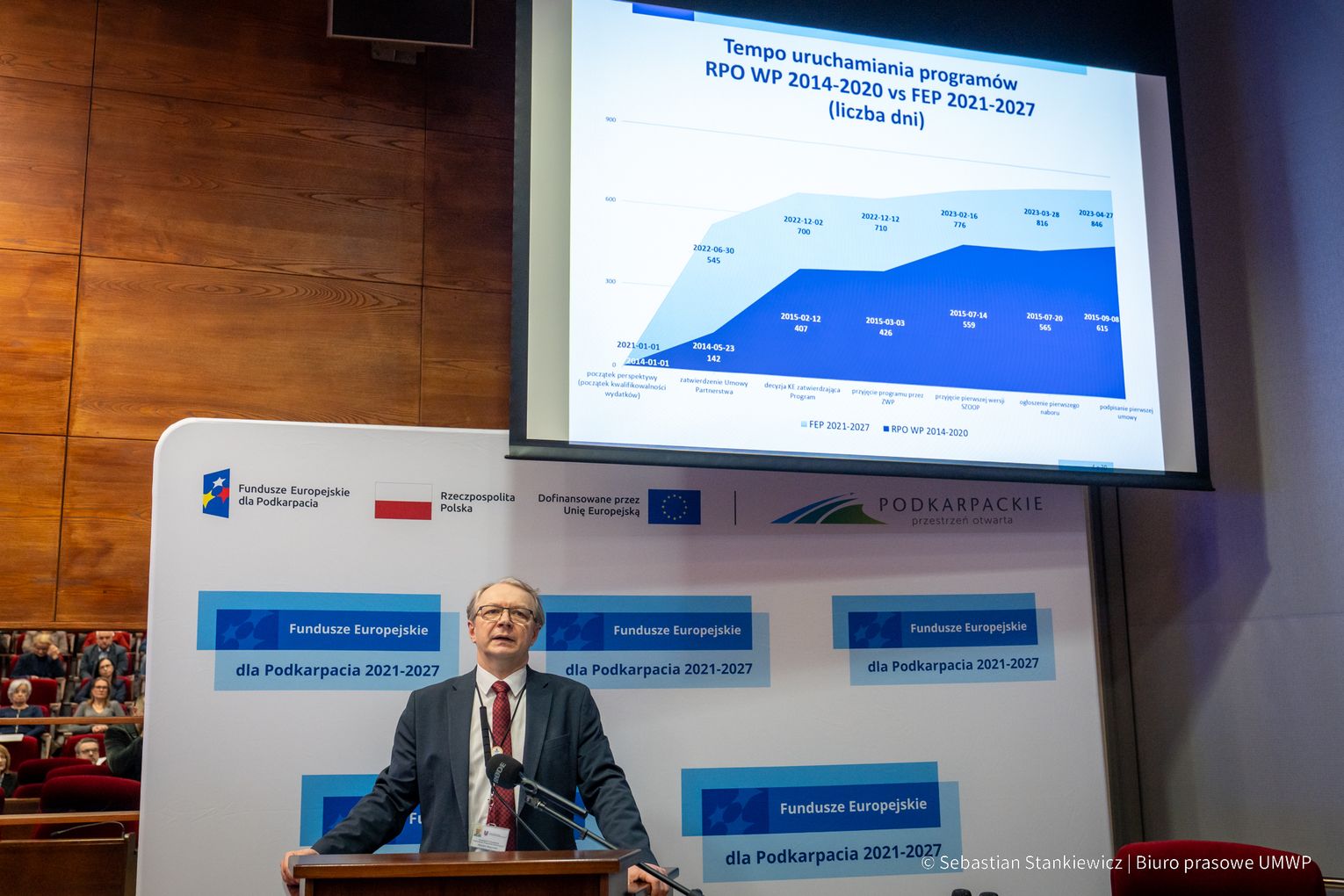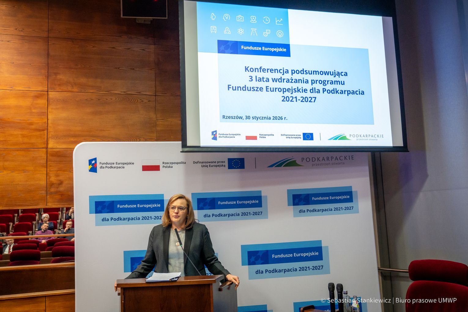 Wśród prelegentów znaleźli się dyrektorzy: Agnieszka Czuchra, Magdalena Sobina, Wojciech Magnowski czy Krzysztof Piela. Są to osoby, które w Urzędzie Marszałkowskim nadzorują departamenty związane z Funduszami Europejskimi. Pan Magnowski odpowiada za kształt całego programu, pani Agnieszka Czuchra kieruje zespołem, który wspiera przedsiębiorców w korzystaniu ze środków unijnych. Dyrektor Sobina zaś stoi na czele Departamentu Programu Wspierania Obszarów Wiejskich, a dyrektor Piela szefuje w Departamencie Wdrażania Projektów Infrastrukturalnych. Nie zabrakło też prezentacji opisującej efekty tzw. działań miękkich, skierowanych głównie do ludzi, w tym osób młodych, seniorów i osób z niepełnosprawnościami. Przedstawił je Tomasz Czop, Dyrektor WUP Rzeszów.