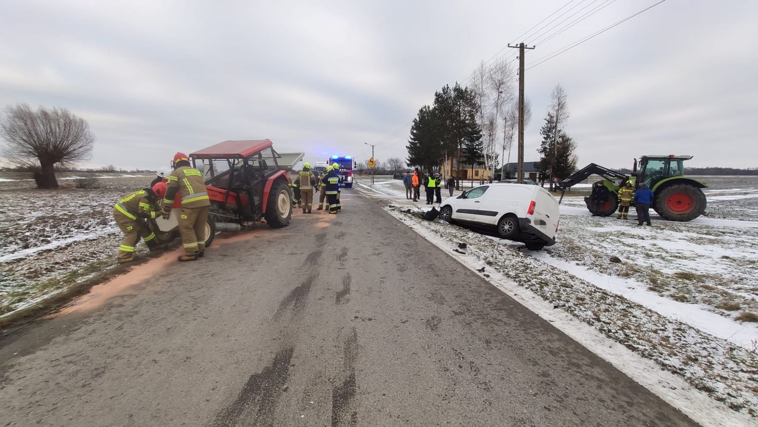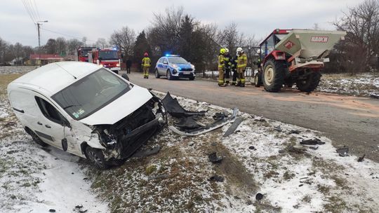 Dzisiaj około godziny 15:00 Państwowa Straż Pożarna w Dąbrowie Tarnowskiej otrzymała zgłoszenie o kolizji samochodu osobowego z ciągnikiem rolniczym, która miała miejsce na drodze powiatowej w miejscowości Zabrnie. Na szczęście, w wyniku zdarzenia nie było osób poszkodowanych. Na miejscu pracowali strażacy, którzy zabezpieczyli wycieki substancji ropopochodnych z ciągnika rolniczego. W wyniku kolizji droga powiatowa jest zablokowana. Samochód osobowy marki Renault znalazł się w przydrożnym rowie.