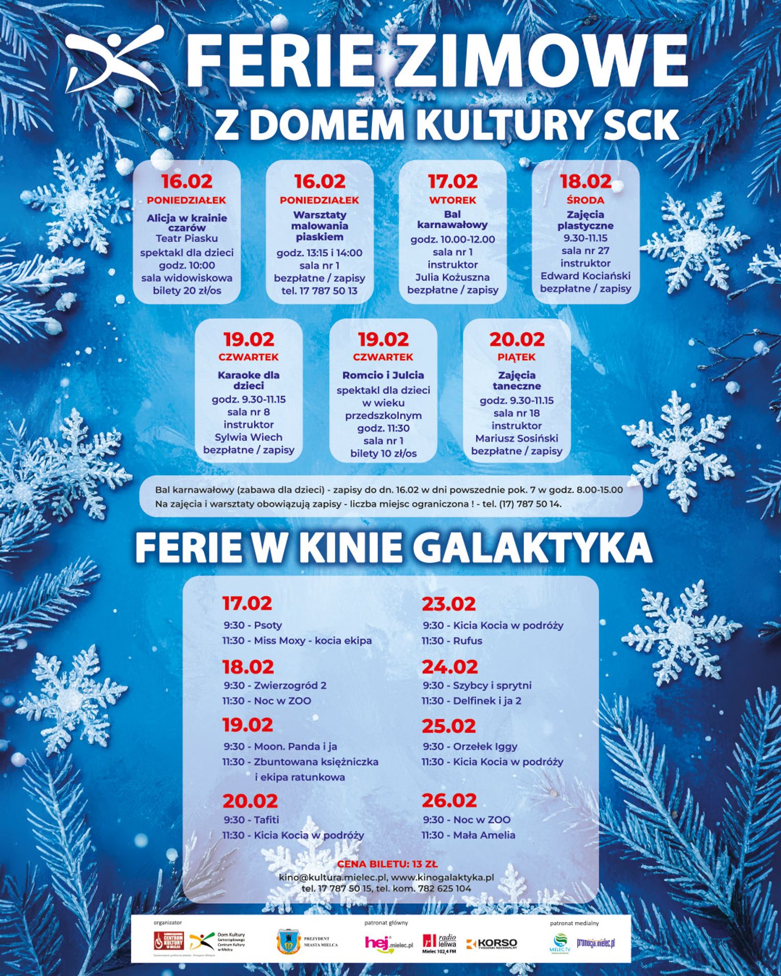 Organizatorzy zajęć zapraszają dzieci i młodzież do aktywnego i kreatywnego spędzenia ferii zimowych w Domu Kultury SCK oraz Kinie Galaktyka. Przygotowali różnorodny program artystyczny i rekreacyjny, prowadzony przez doświadczonych instruktorów i zaproszone zespoły.