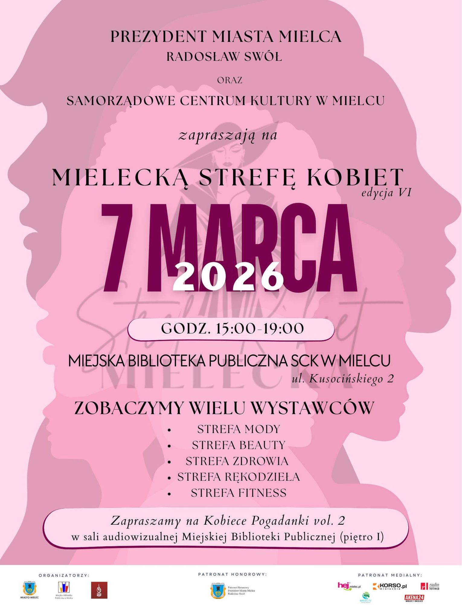 Strefa Kobiet organizowana jest przez Urząd Miejski w Mielcu, Samorządowe Centrum Kultury w Mielcu oraz Miejską Bibliotekę Publiczną SCK w Mielcu, pod patronatem Prezydenta Miasta Mielca, Radosław Swół.