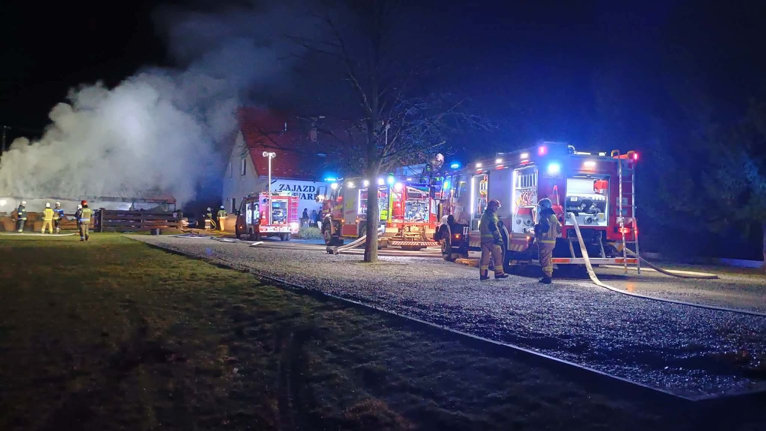 Służby zostały zaalarmowane około godziny dwudziestej, że na terenie Zajazdu Folwark w miejscowości Grzybów doszło do pożaru budynku gospodarczego i blaszanej wiaty, na miejsce zadysponowano liczne zastępy straży pożarnej i policję.