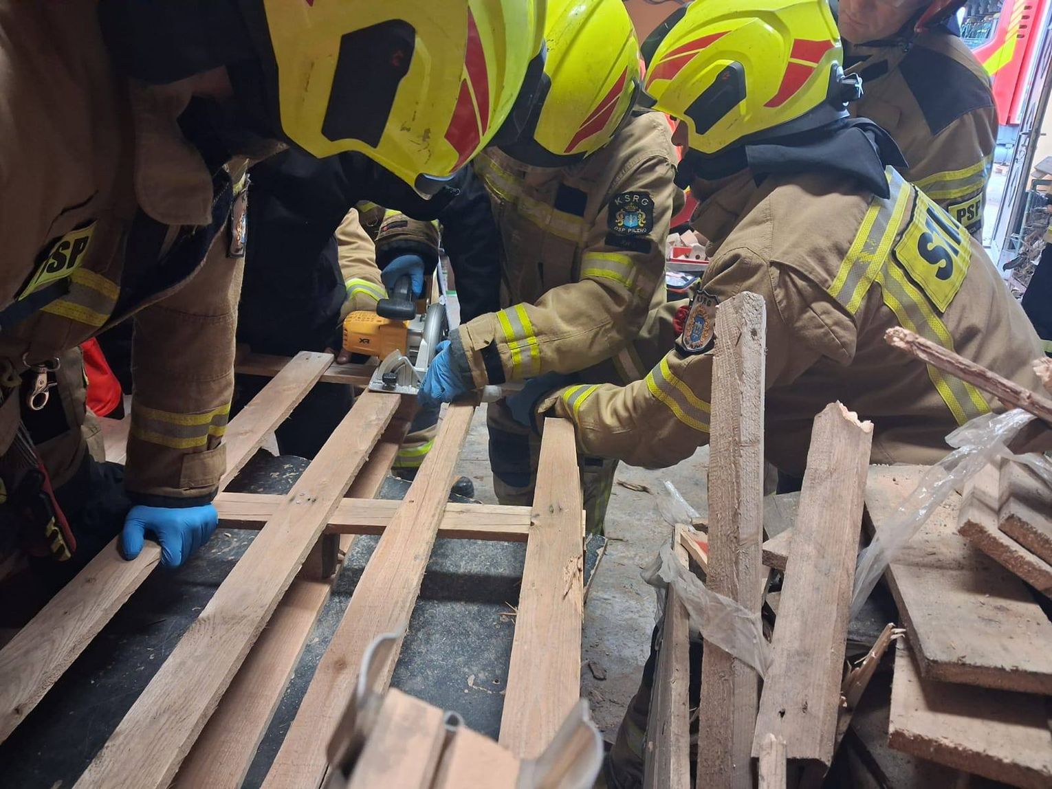Aby bezpiecznie uwolnić pracownika, ratownicy podjęli decyzję o wycięciu fragmentu drewnianej palety razem z przybitą dłonią. Taki sposób działania pozwolił ograniczyć dodatkowe uszkodzenia tkanek i przygotować poszkodowanego do transportu medycznego.