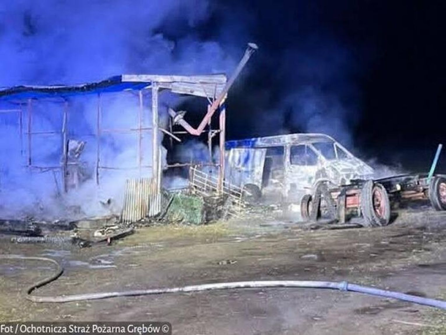 W sobotę, 21 marca 2026 roku o godz. 19:47 służby zostały zadysponowane do pożaru na prywatnej posesji w Grębowie. Początkowe zgłoszenie dotyczyło pożaru wiaty, jednak po przybyciu na miejsce strażacy potwierdzili, że ogniem objęty był barak gospodarczy, samochód dostawczy oraz wóz rolniczy.