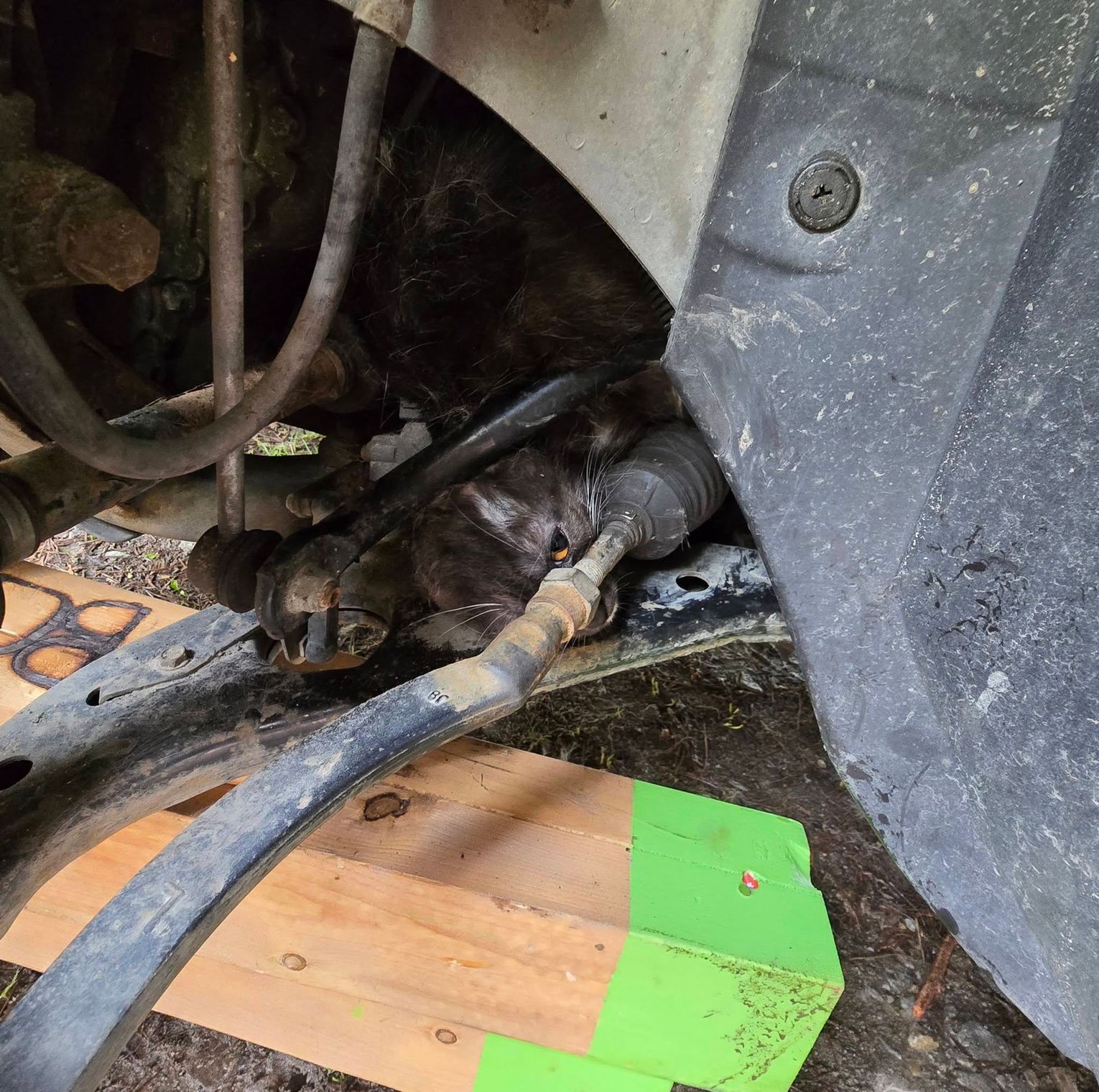 Do zdarzenia doszło 29 marca około godziny 12:30. Zgłoszenie, które wpłynęło do służb, zostało zakwalifikowane jako „miejscowe zagrożenie”. Na miejscu szybko okazało się jednak, że sytuacja jest poważna – przerażone zwierzę zaklinowało się głęboko pomiędzy elementami zawieszenia i układu kierowniczego pojazdu.