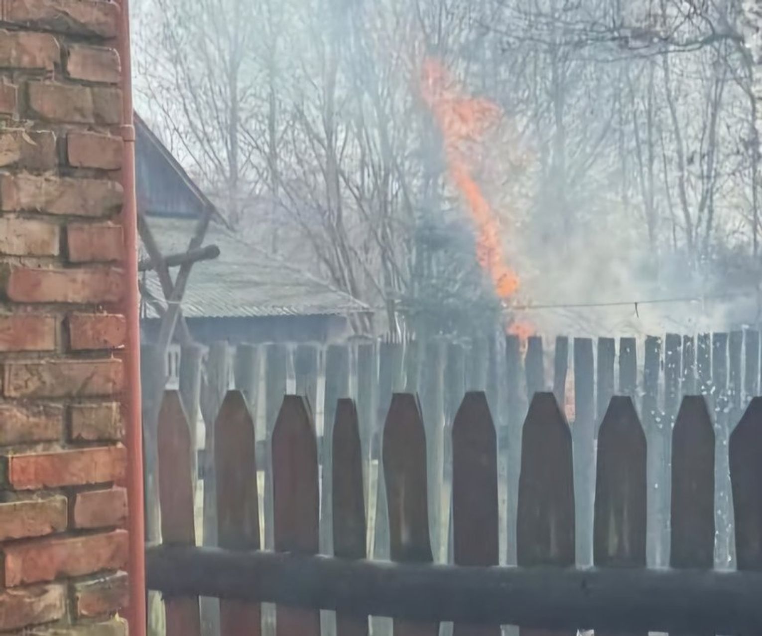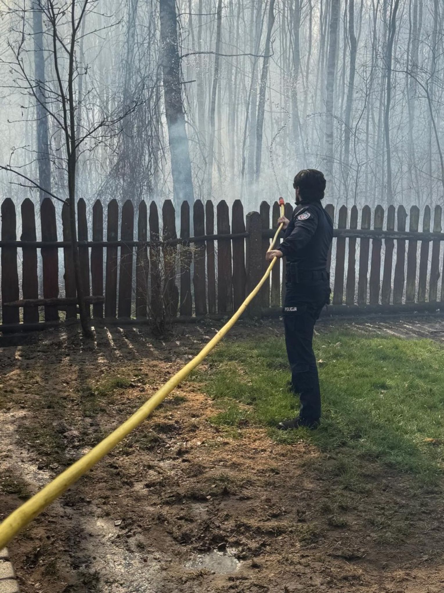 Na miejscu zastali kobietę, która samodzielnie próbowała gasić ogień przy użyciu węża ogrodowego. Pożar obejmował teren znajdujący się za jej posesją i bezpośrednio zagrażał budynkowi mieszkalnemu. Dodatkowo silne zadymienie znacznie utrudniało oddychanie.