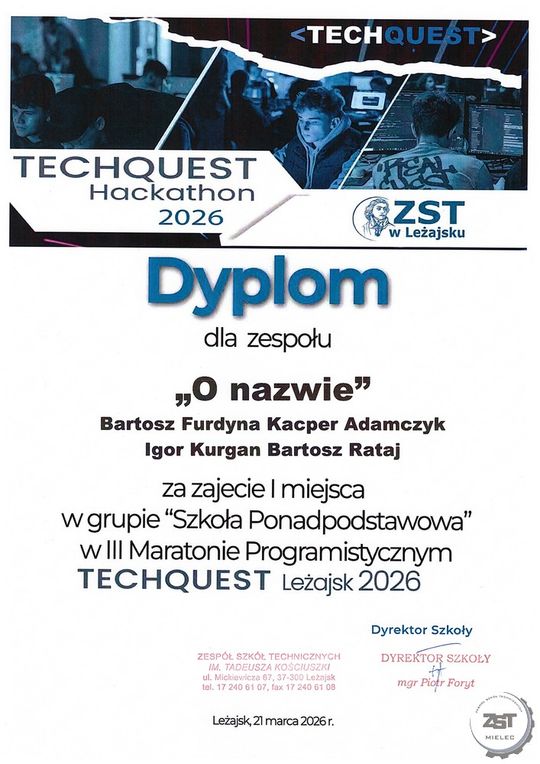 Podwójne zwycięstwo uczniów ZST Mielec w hackathonie TECHQUEST 2026 w Leżajsku